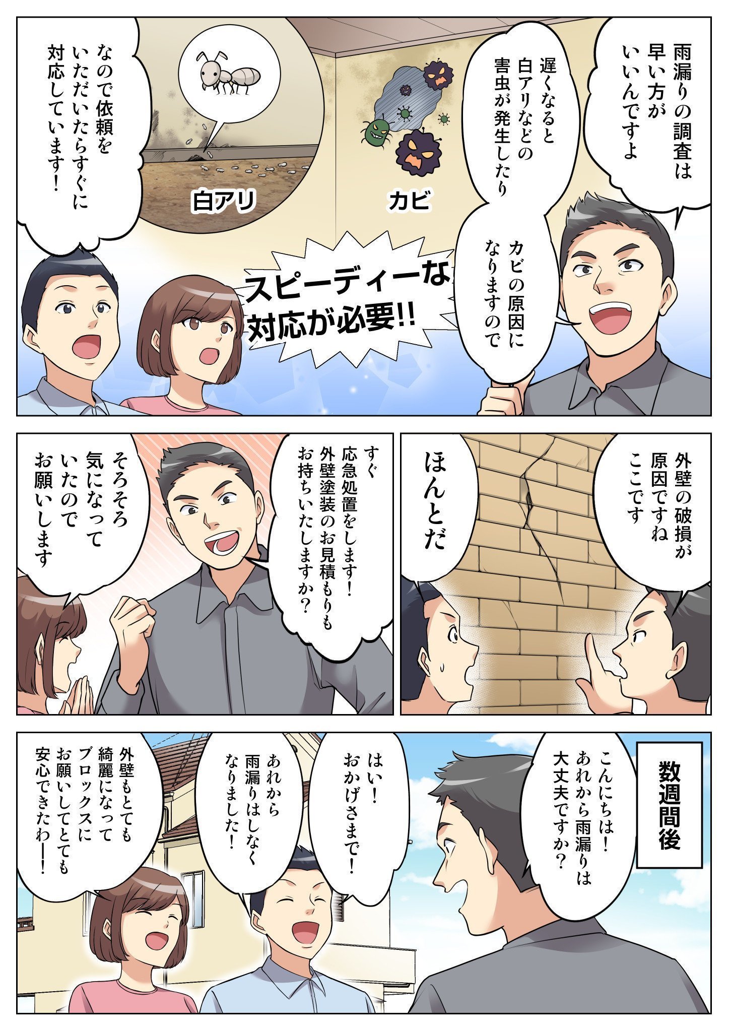 弊社では、しっかりと現地調査を実施して建物の状態を把握し、具体的な施工費用などを算出。そのうえで、工事のご提案をしております。うわべだけのご提案・施工ではない適切な対応をいたしますので、安心してお任せください。
